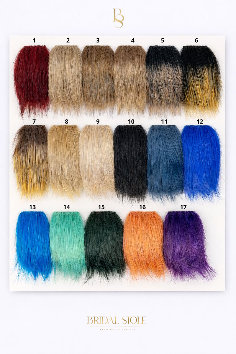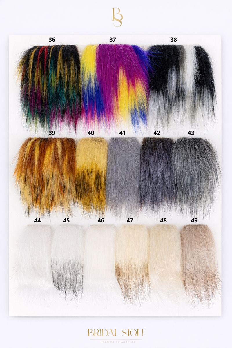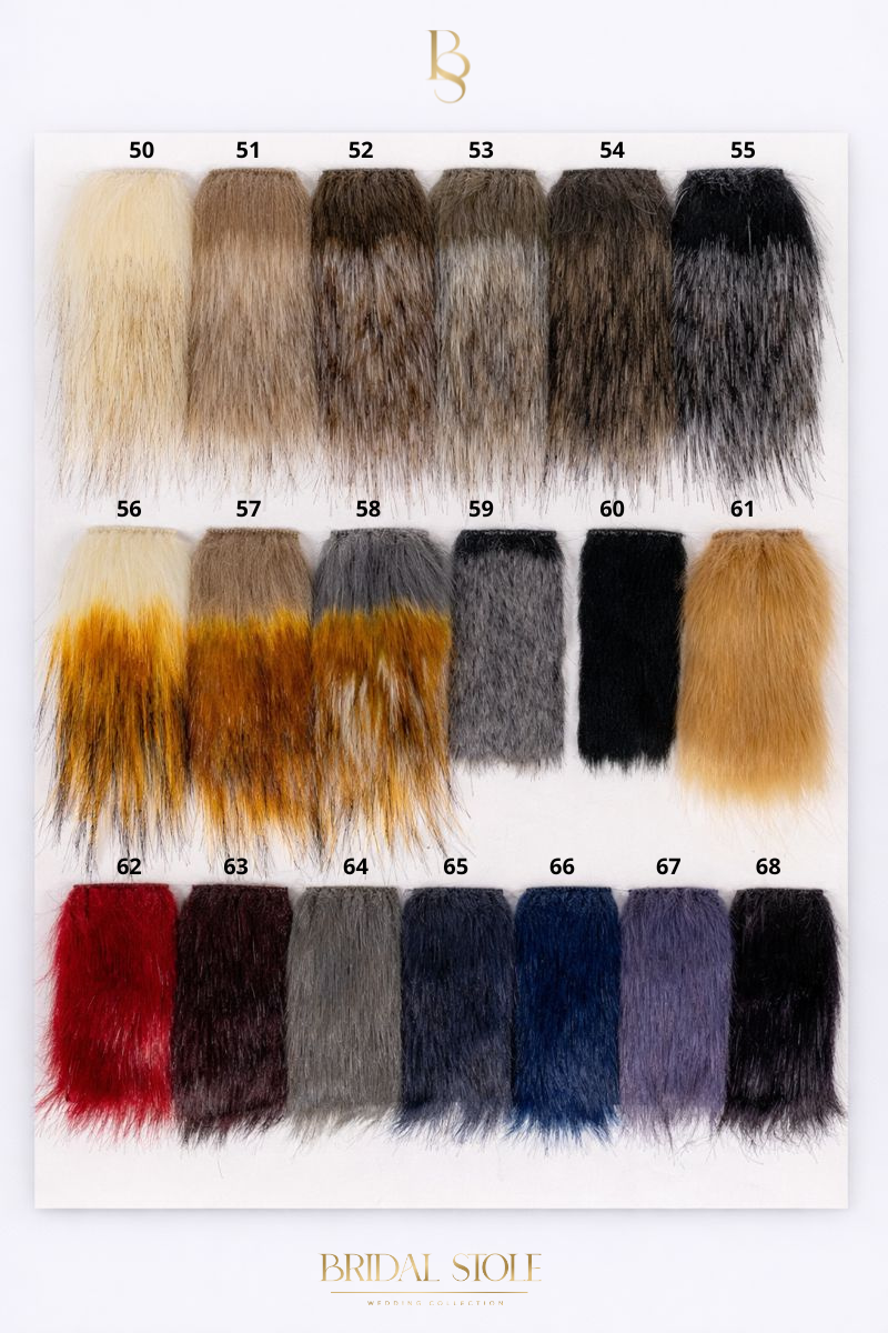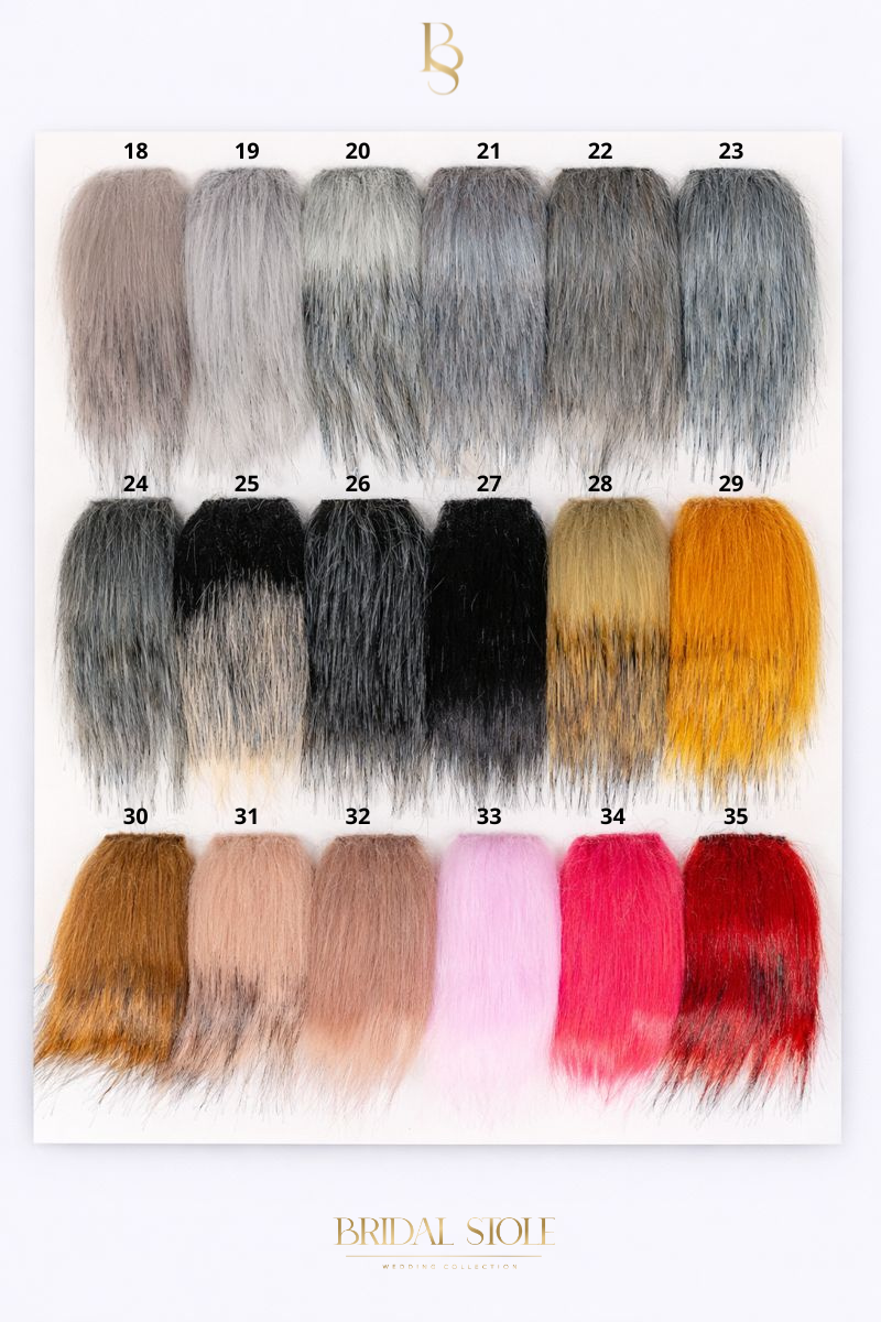 Each long-pile fur wrap can be made to order in a colour selected from the swatch chart below. Simply choose your preferred fur wrap model on the website, select “made to measure” in the size chart, and during checkout write the fur colour number in the comment section.