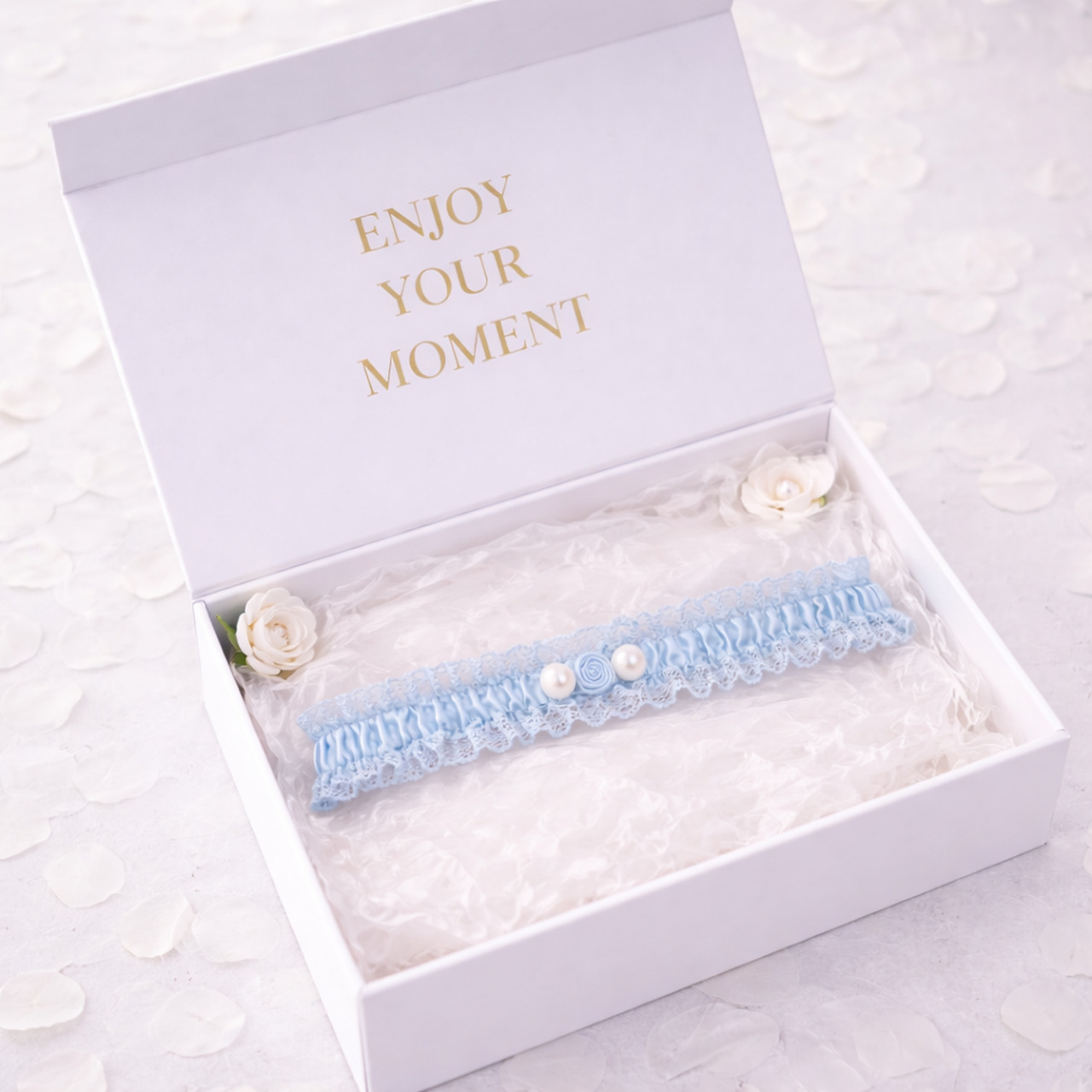 This handmade blue bridal garter is perfect as a gift for the bride-to-be. It is an elegant, symbolic gift that will remain a beautiful keepsake from this special day.
