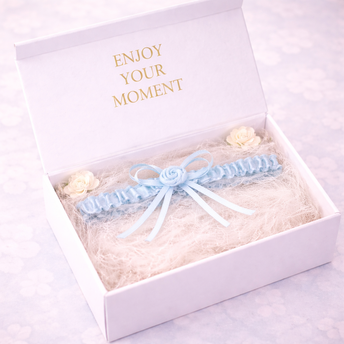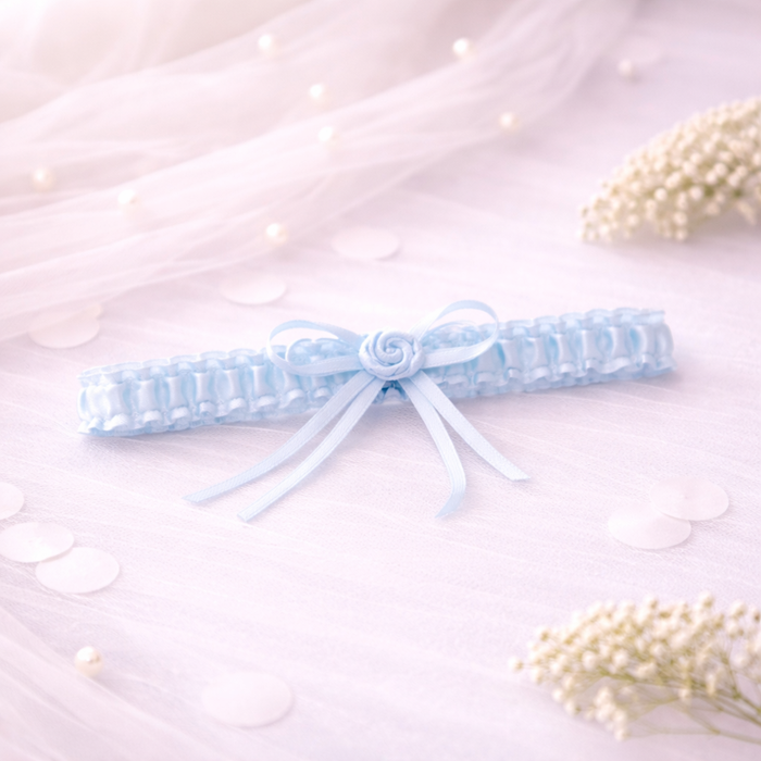 This blue satin bridal garter pairs perfectly with both minimalist and richly decorated wedding gowns.