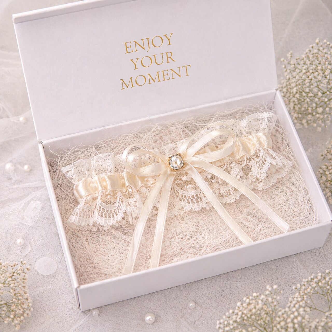 While tradition speaks of “something blue”, more and more brides choose an ecru bridal garter that blends seamlessly with the entire wedding outfit and creates a cohesive, elegant look.