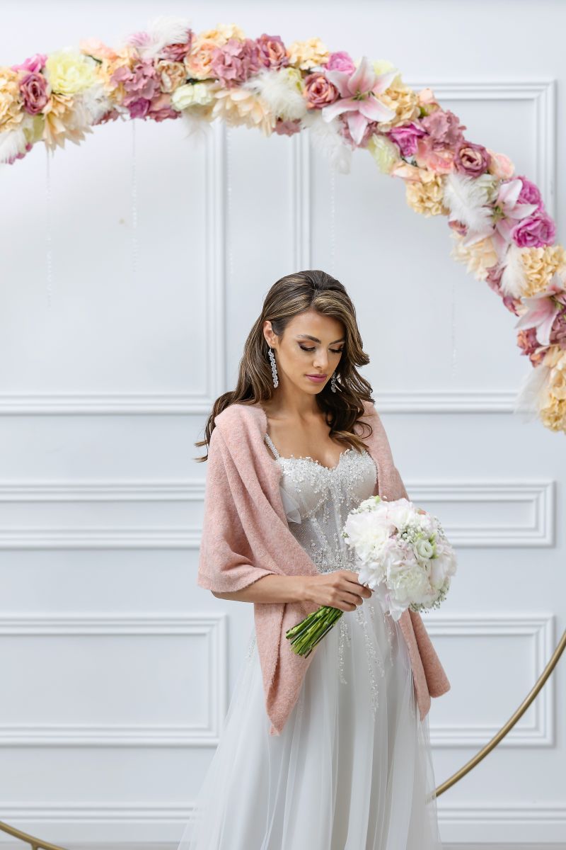 This bridal shawl in powder pink is delicate and stylish, making it perfect for special occasions. Made from a yarn blend, the shawl is exceptionally soft and pleasant to the touch. It is hypoallergenic, gentle on the skin, and its warmth ensures comfort on cooler days. The elegant powder pink shade can be worn in various ways, allowing you to adapt it to your personal style and preferences. This shawl is the ideal accessory for autumn and winter weddings, combining comfort, elegance, and style.