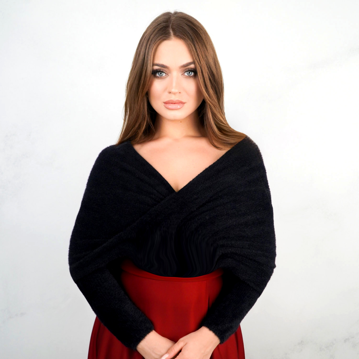 Choose the HANNAH black bridal stole for timeless style, comfort, and the perfect finishing touch for your wedding dress.