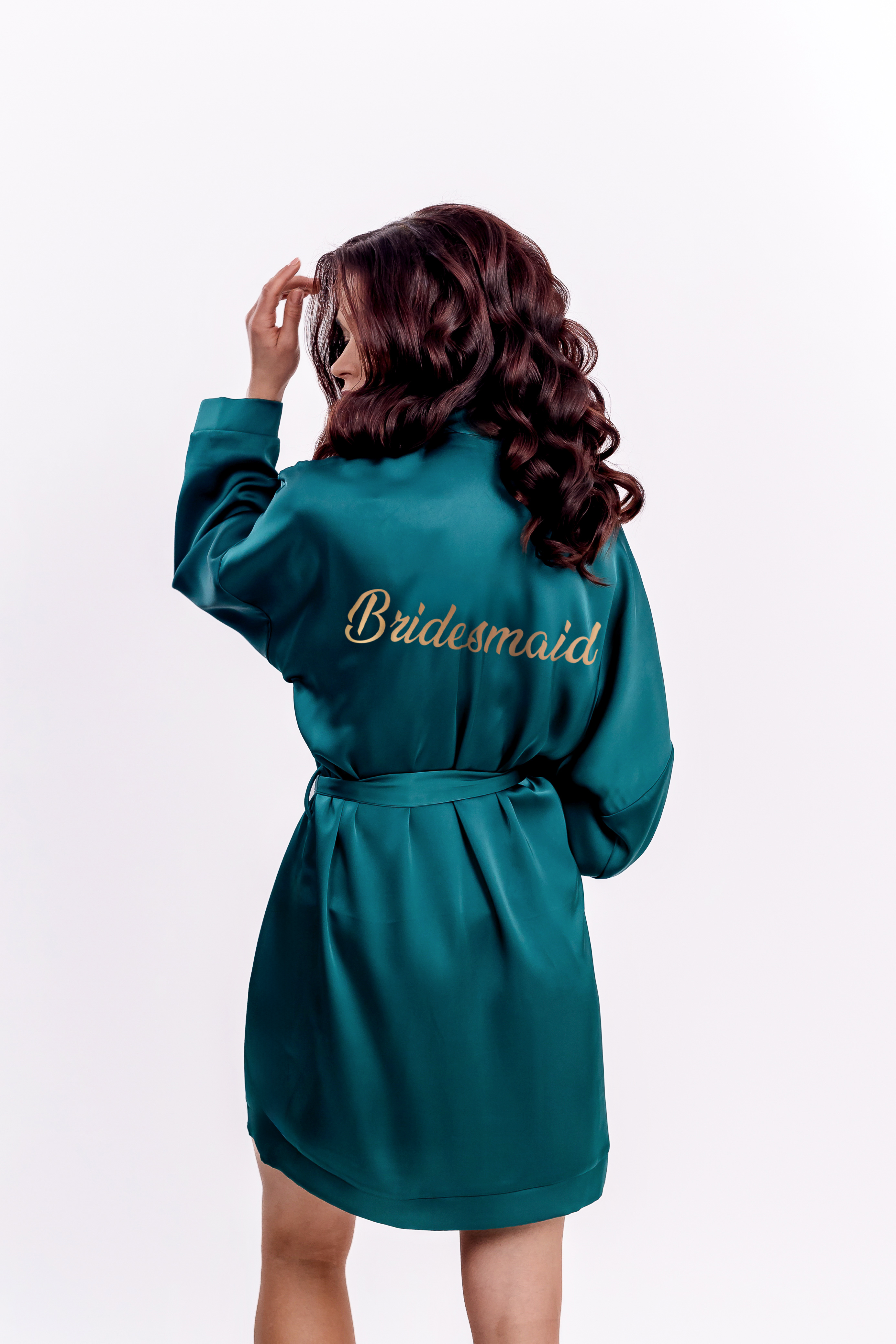 Satin Bridal Robe for Maid of Honor or Bridesmaid – Bottle Green with Gold Lettering