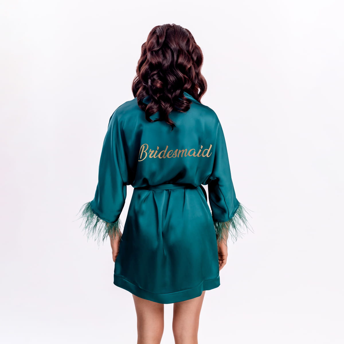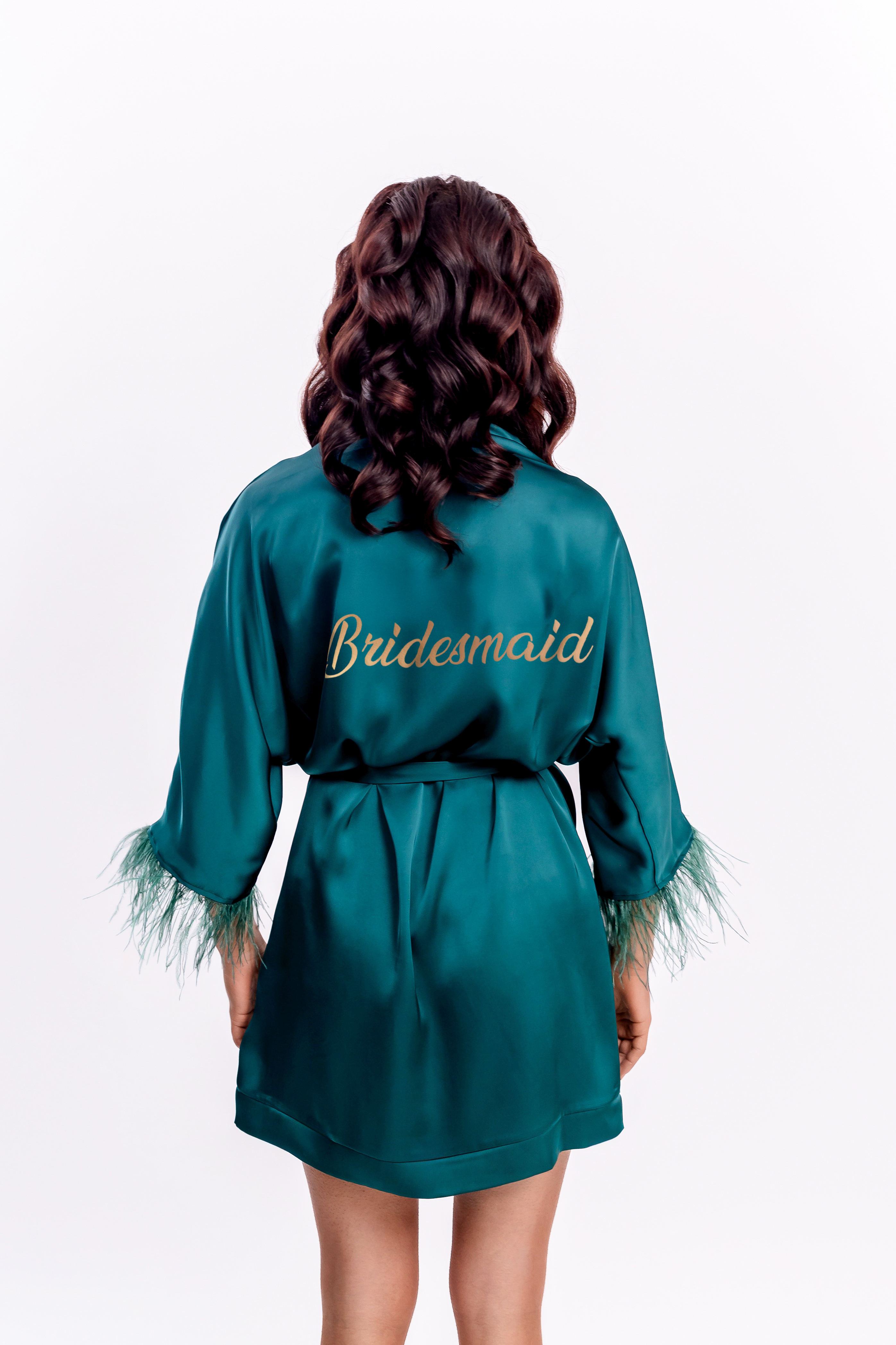 The bridal robe for the bridesmaid in a deep, vibrant bottle green color is the perfect combination of elegance and class. Made from soft, subtly shimmering satin, it provides not only comfort but also a beautiful and stylish appearance. The delicate feathers adorning the sleeves add lightness and sophistication, while the tasteful gold lettering on the back emphasizes the special role of the maid of honor on this unique day.