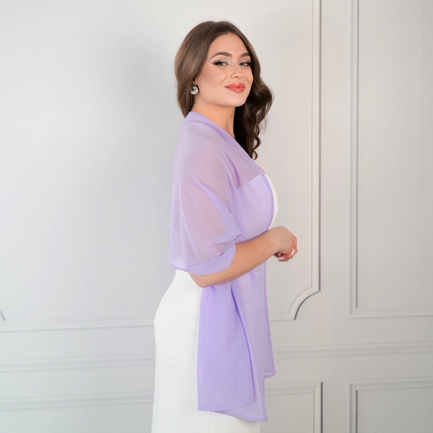 Dzięki swojej prostocie i elegancji fioletowy szal szyfonowy sprawdzi się zarówno przy stylizacjach romantycznych, klasycznych, jak i glamour. Lekki materiał nie obciąża kreacji, a jednocześnie subtelnie otula ramiona, zapewniając komfort podczas ceremonii, wesela lub wieczornego wyjścia.