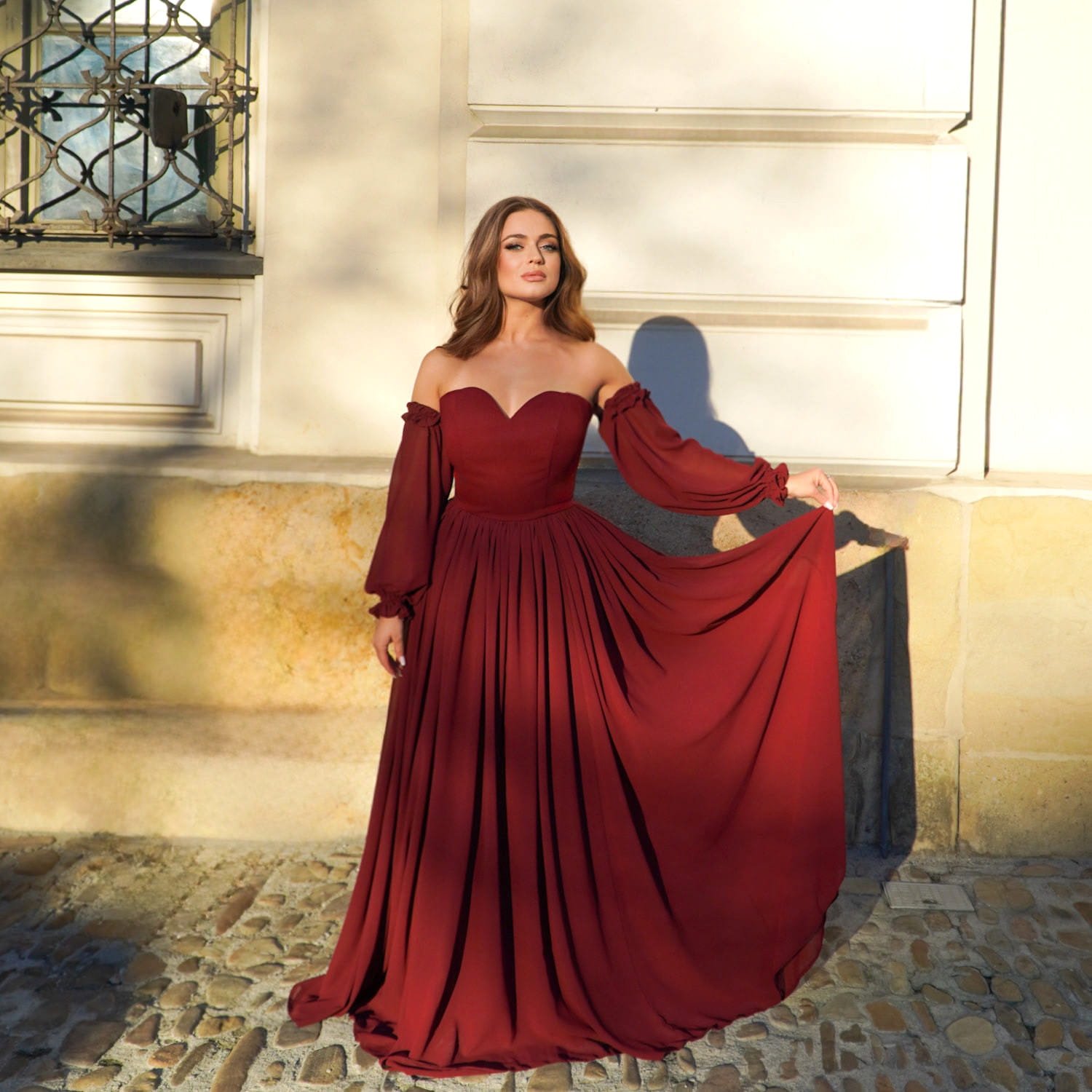 Odkryj bordową, długą suknię wieczorową ARLETTE – elegancką kreację dla kobiet, które kochają romantyzm, klasę i nowoczesny styl. Ta suknia na wesele, bal, studniówkę i gale zachwyca gorsetową górą z dekoltem w kształcie serca, zwiewnymi szyfonowymi rękawami off shoulder oraz rozkloszowanym, lekkim dołem, który pięknie pracuje w ruchu.