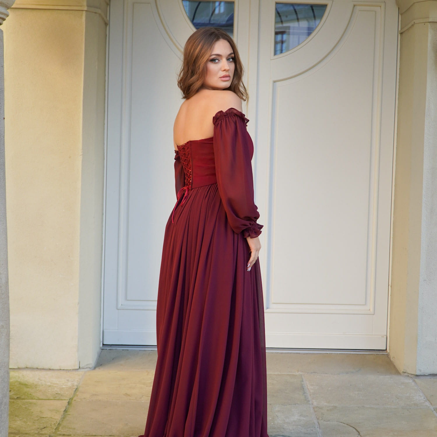 ARLETTE II – Bordo Długa Suknia Wieczorowa z Gorsetem i Szyfonowymi Rękawami