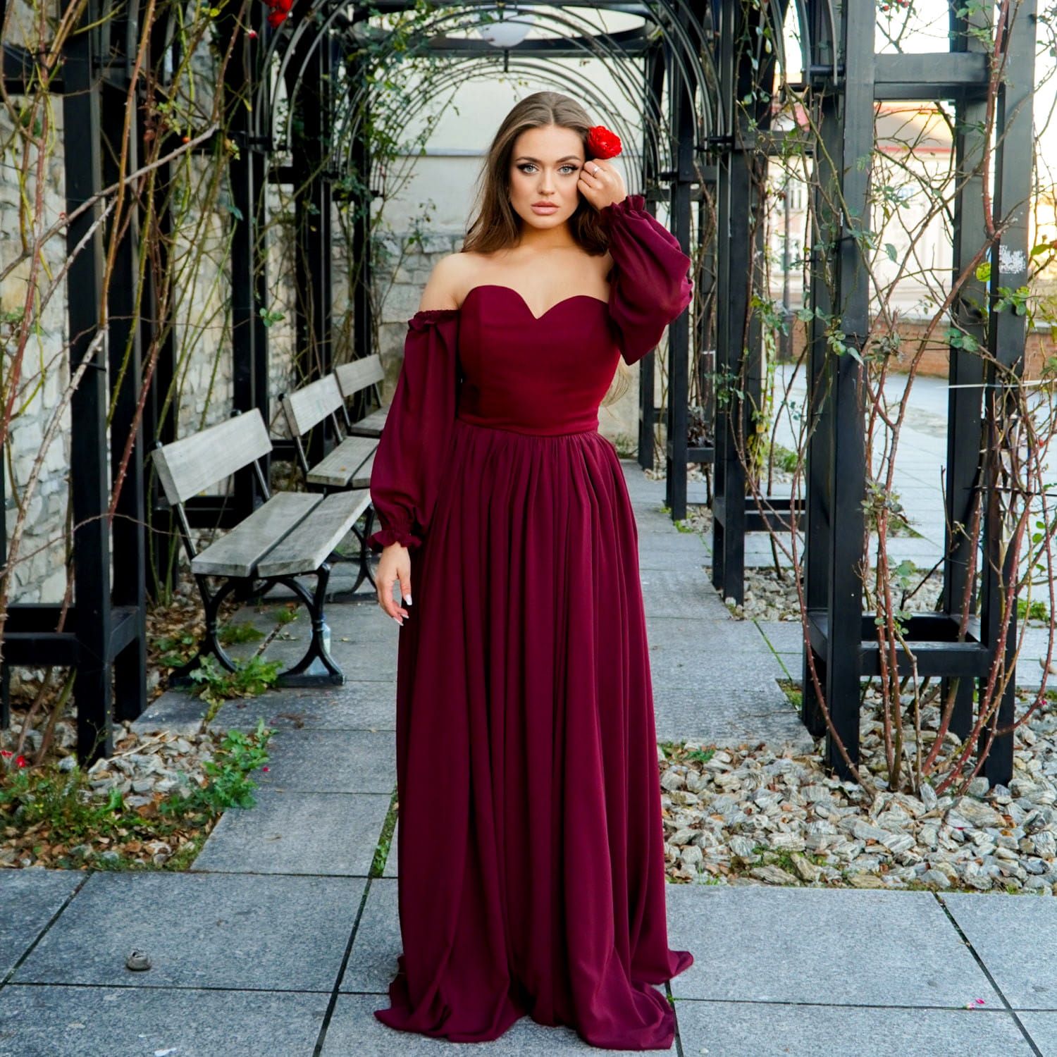 ARLETTE to idealna bordowa suknia wieczorowa, suknia na sesję zdjęciową, elegancka suknia na wesele oraz wyjątkowa propozycja dla miłośniczek stylu glamour. To model, który łączy nowoczesność, ponadczasową elegancję i kobiecy wdzięk.