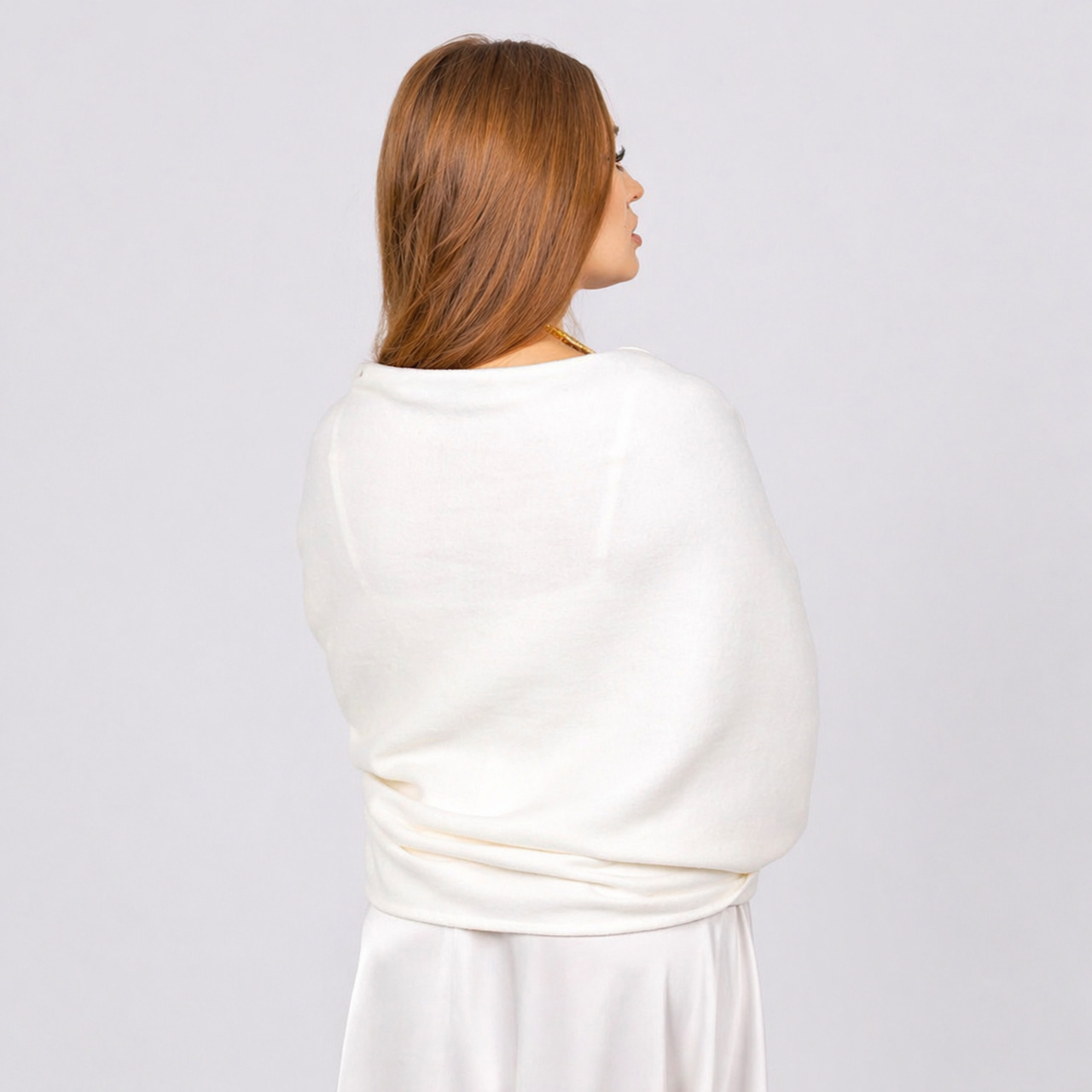 Uniwersalny szal dla panny młodej ecru sprawdzi się zarówno do klasycznych, jak i nowoczesnych sukni. Może być noszony jako szal ślubny na wesele ecru, okrycie do sukni ślubnej ecru lub lekka narzutka na ślub ecru.
