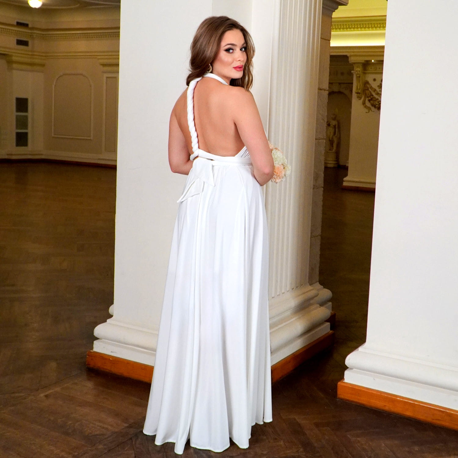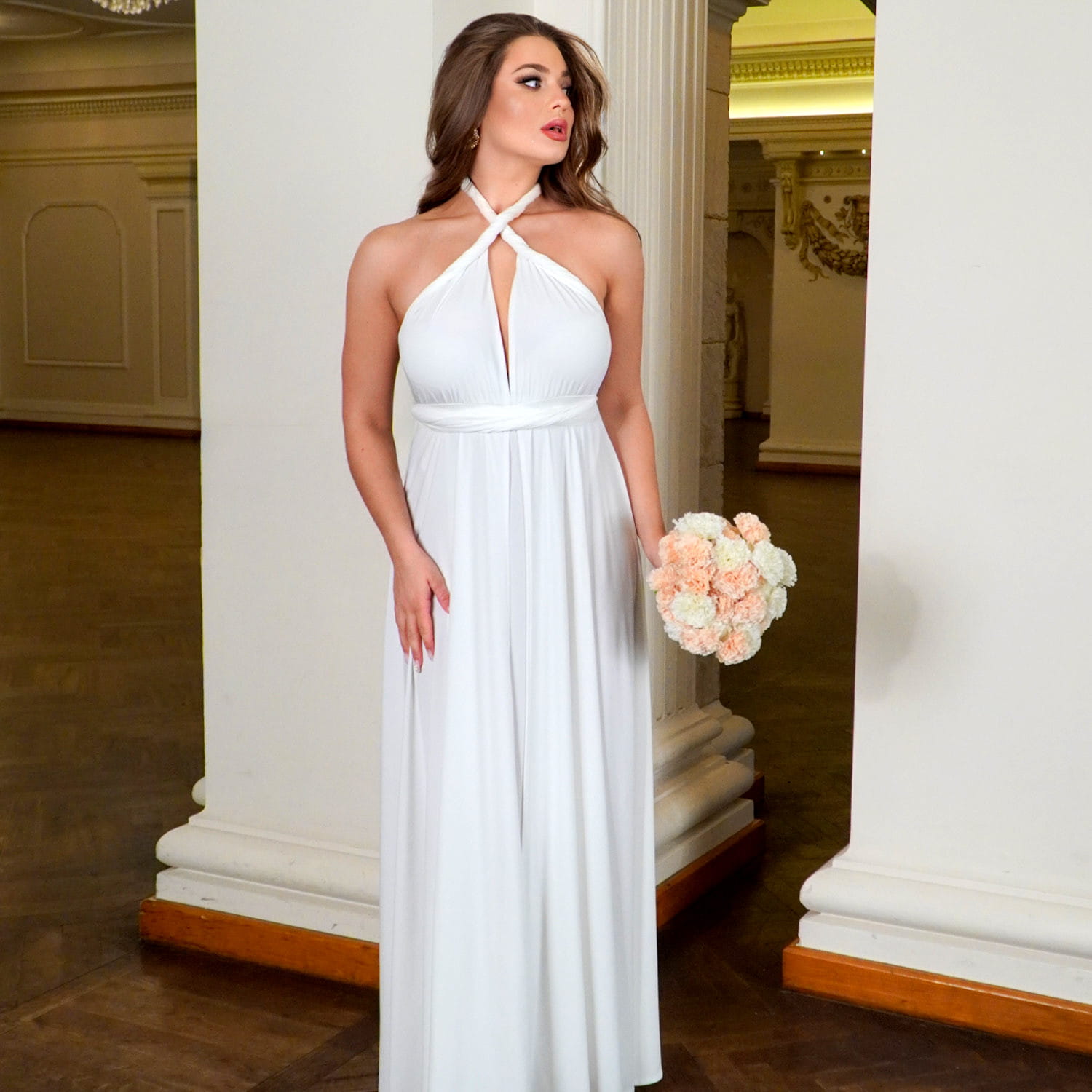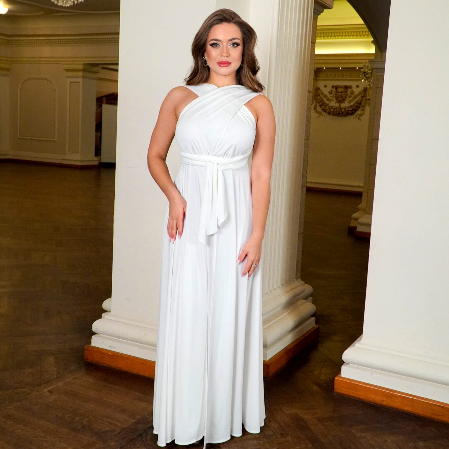 Długa biała sukienka maxi na wesele została wykonana z wysokiej jakości wiskozy – miękkiej, oddychającej i przyjemnej w dotyku tkaniny, która pięknie układa się na sylwetce i zapewnia komfort noszenia przez cały dzień i noc. Ta biała sukienka na ślub cywilny subtelnie dopasowuje się do figury, podkreśla talię, wysmukla sylwetkę i wygląda zjawiskowo zarówno w ruchu, jak i na zdjęciach.