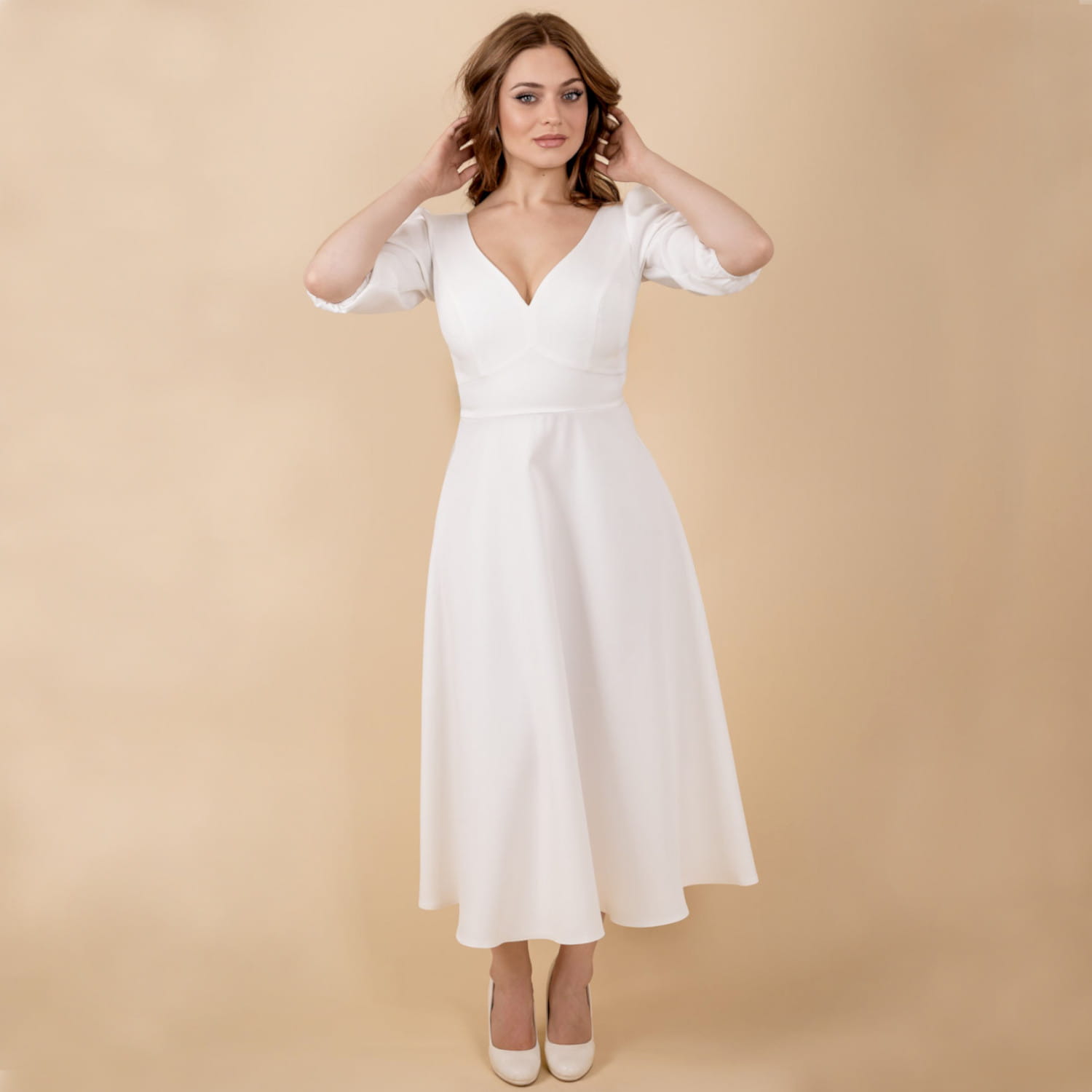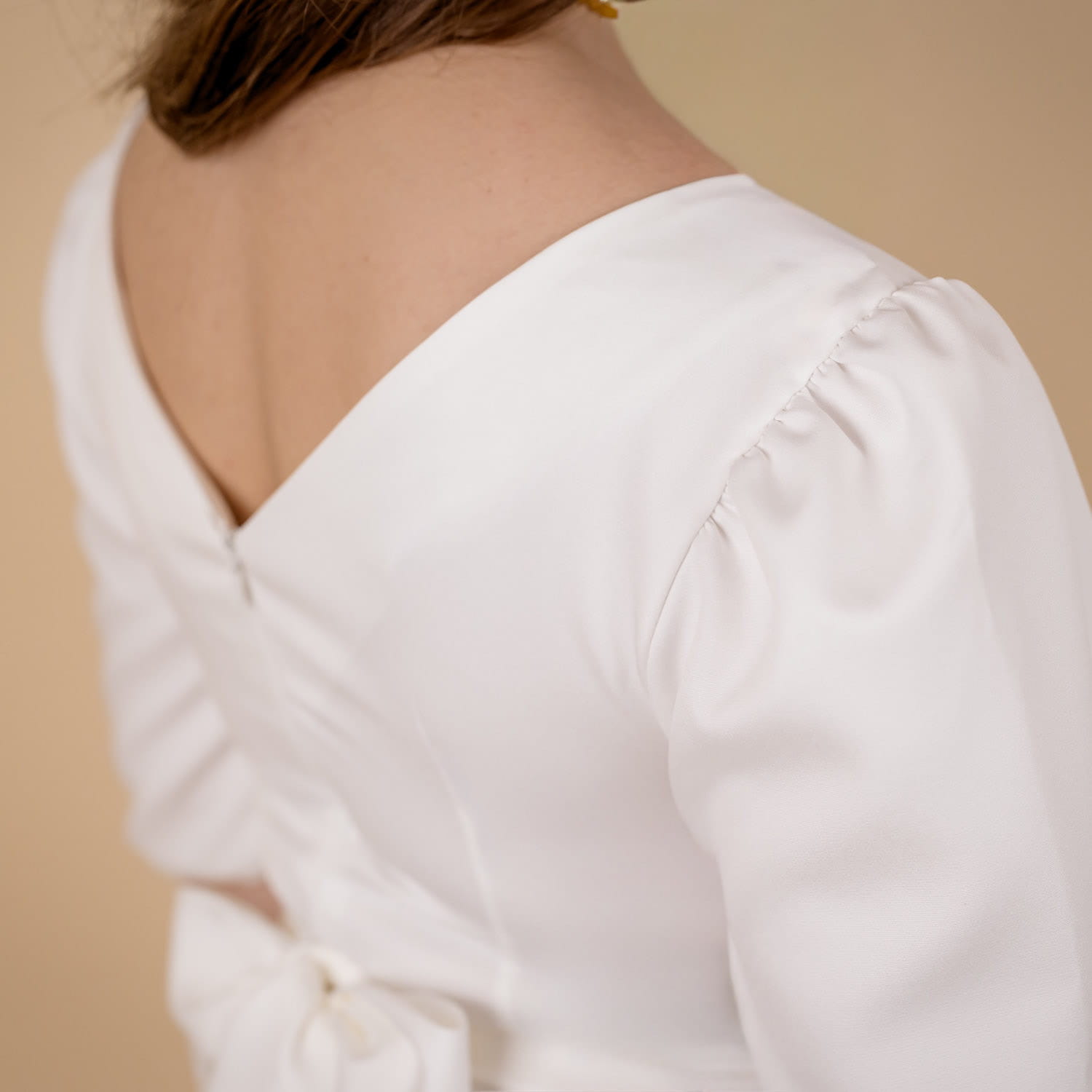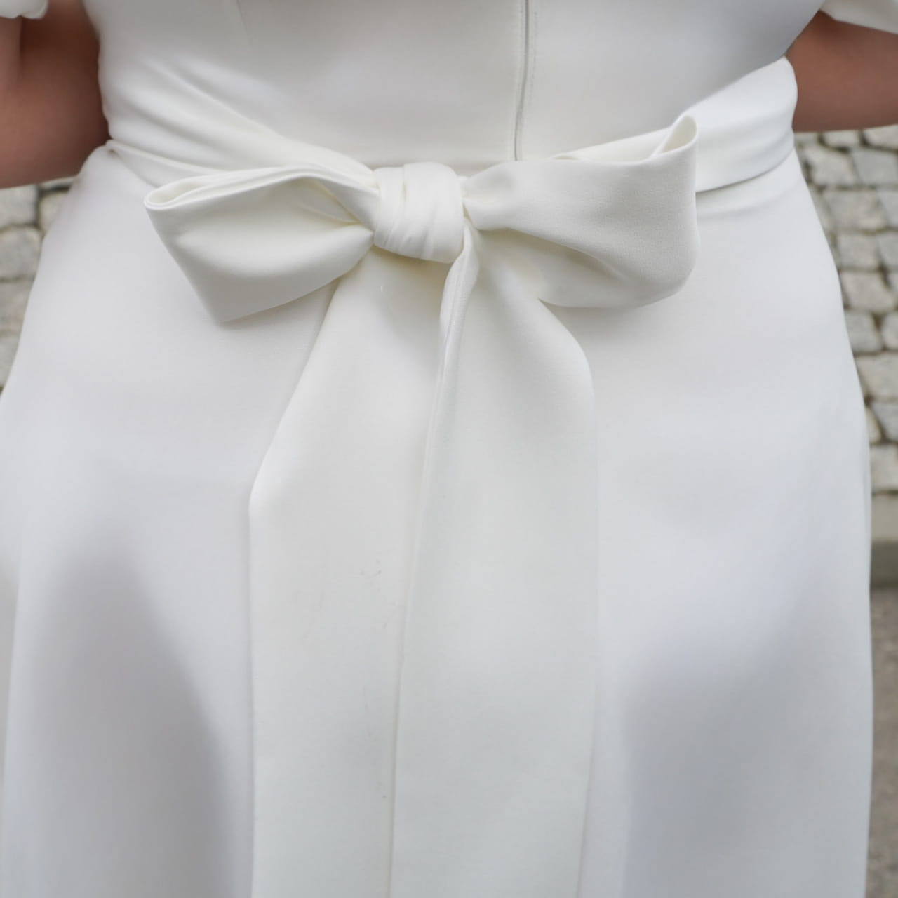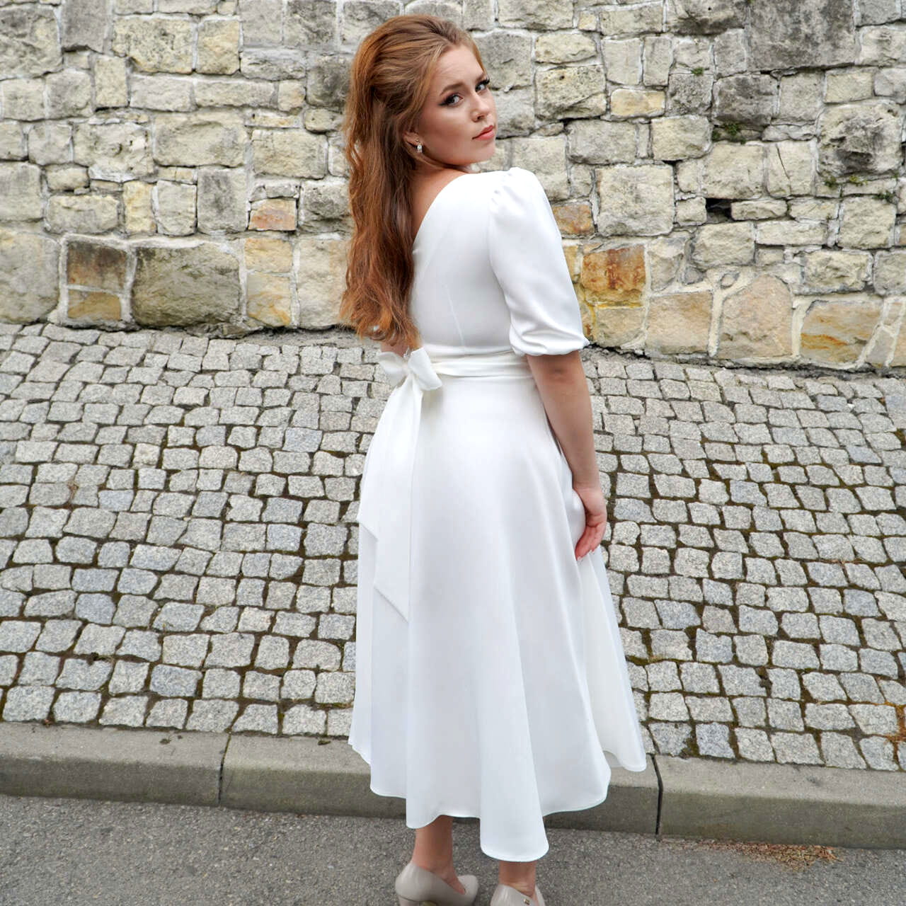 midi ecru z bufkami i kokardą na wesele i ślub.