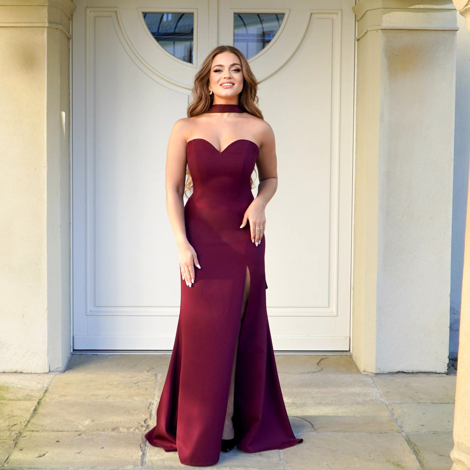 MARGOT II – Bordowa Długa Suknia Wieczorowa z Dekoltem Serce i Rozcięciem na Bal, Studniówkę i Sylwestra