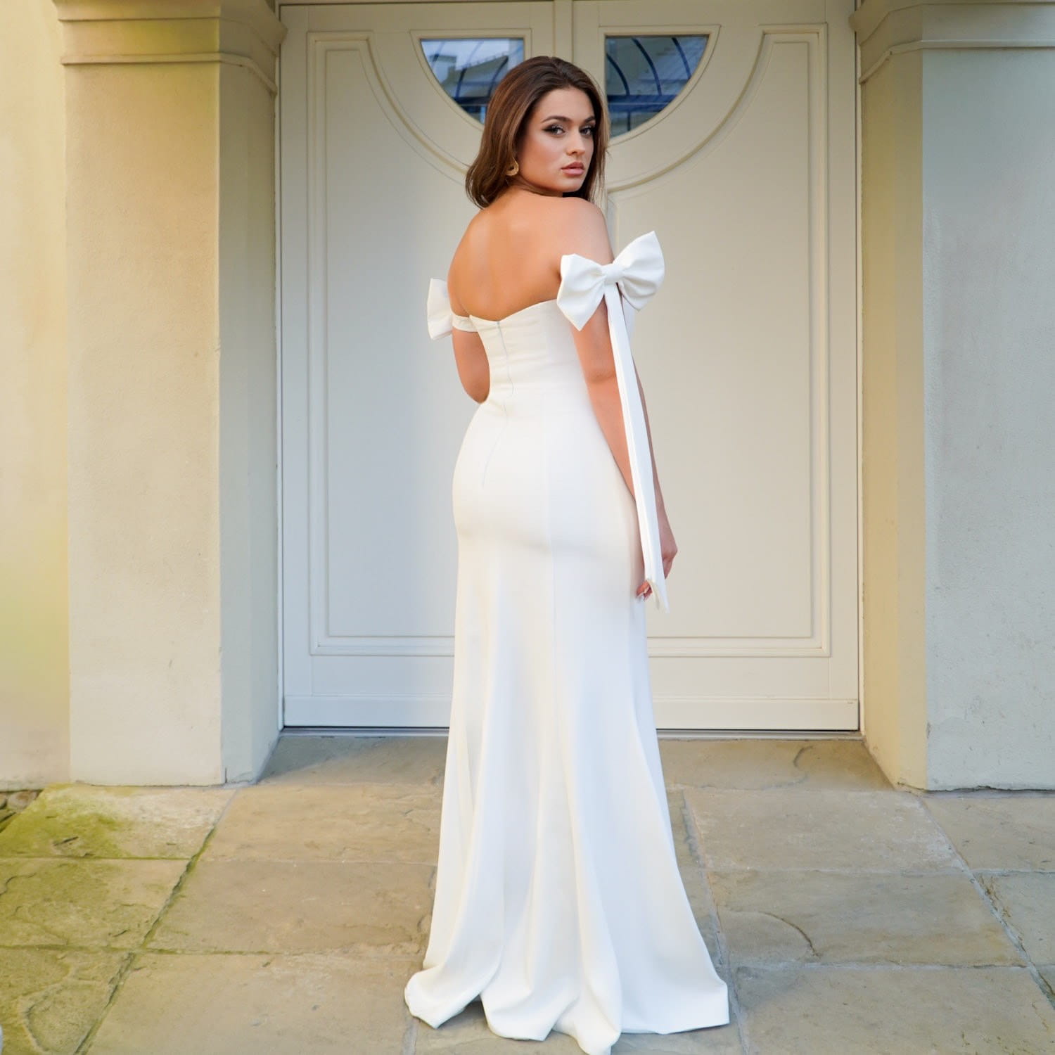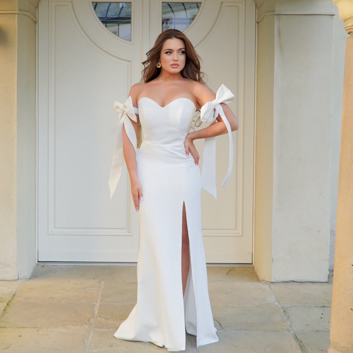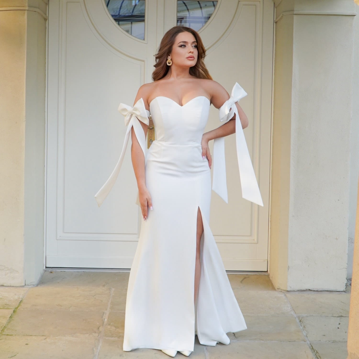 Ta długa biała suknia ślubna z kokardą to doskonały wybór na wiele okazji – ślub cywilny, poprawiny, zaręczyny, sesję zdjęciową, bal lub eleganckie przyjęcie. Sprawdzi się również jako nowoczesna suknia ślubna 2026 dla kobiet, które cenią minimalizm, klasę i kobiecość.