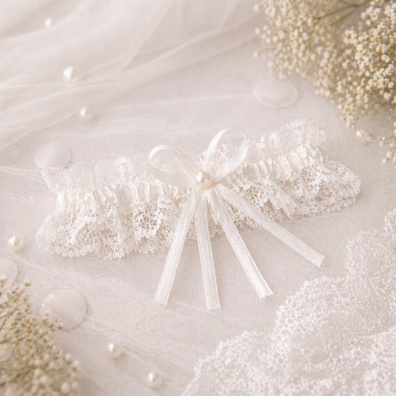 Podwiązka biała dla Panny Młodej – elegancka koronkowa podwiązka ślubna z perełką na wesele | handmade