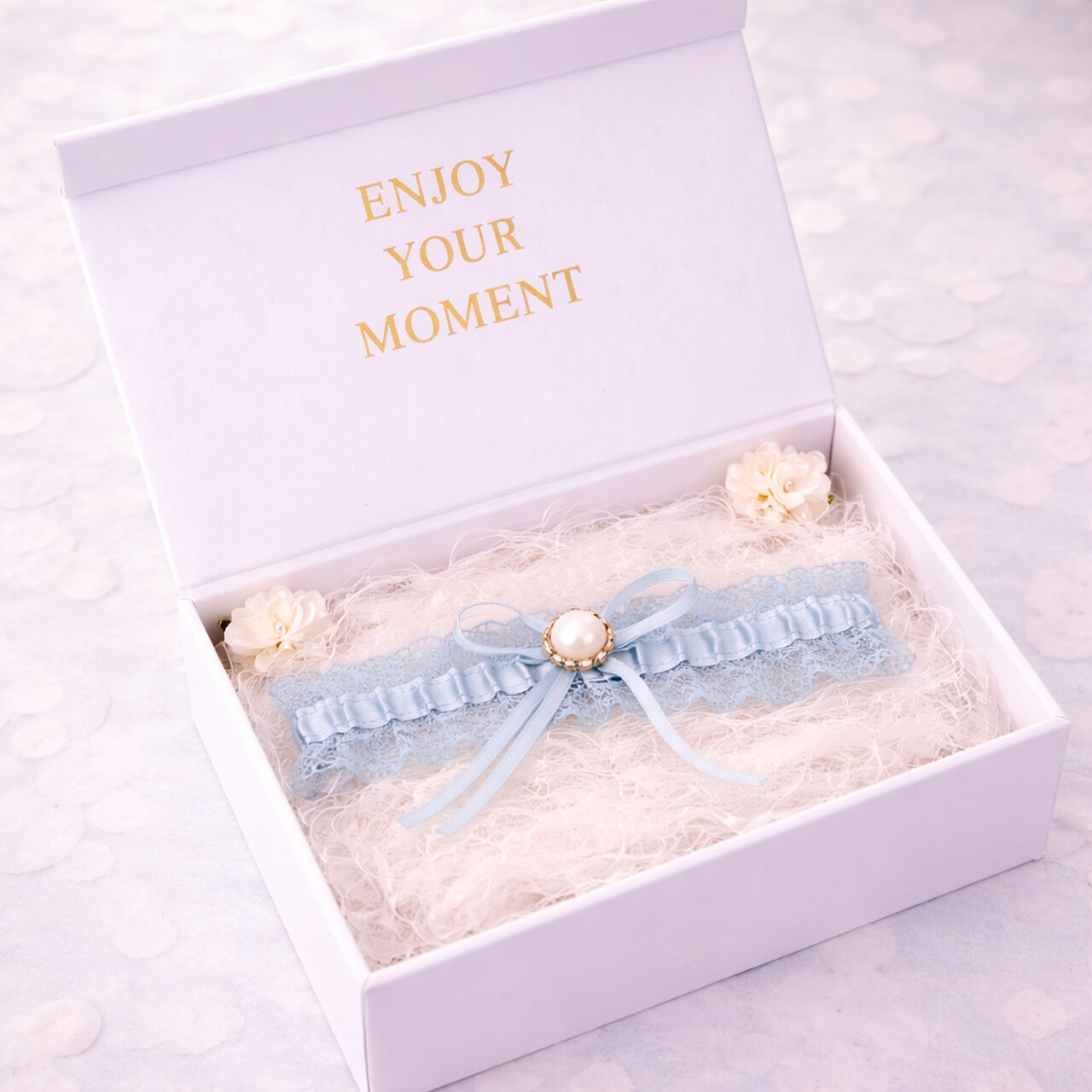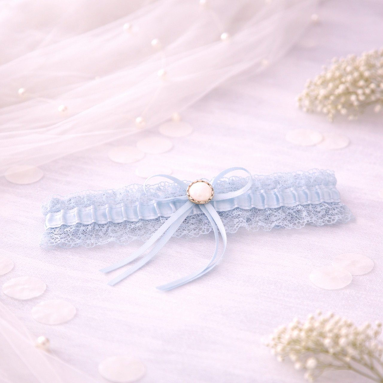 To klasyczny element tradycji ślubnej „coś niebieskiego”, który symbolizuje wierność i szczęście oraz stanowi elegancki, subtelny akcent stylizacji.