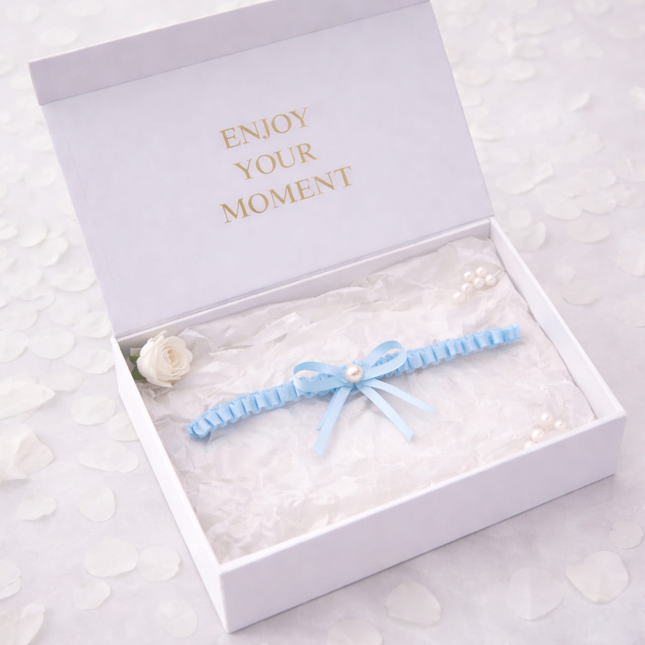 Prosta niebieska podwiązka zachwyca elegancką subtelnością. Mała kokardka z perełką stanowi delikatny akcent i podkreśla romantyczny charakter dodatku. Ta podwiązka ślubna to idealny wybór dla Panien Młodych, które cenią klasyczne i minimalistyczne akcesoria ślubne. Doskonale sprawdzi się zarówno podczas ceremonii, jak i wesela oraz sesji zdjęciowej.